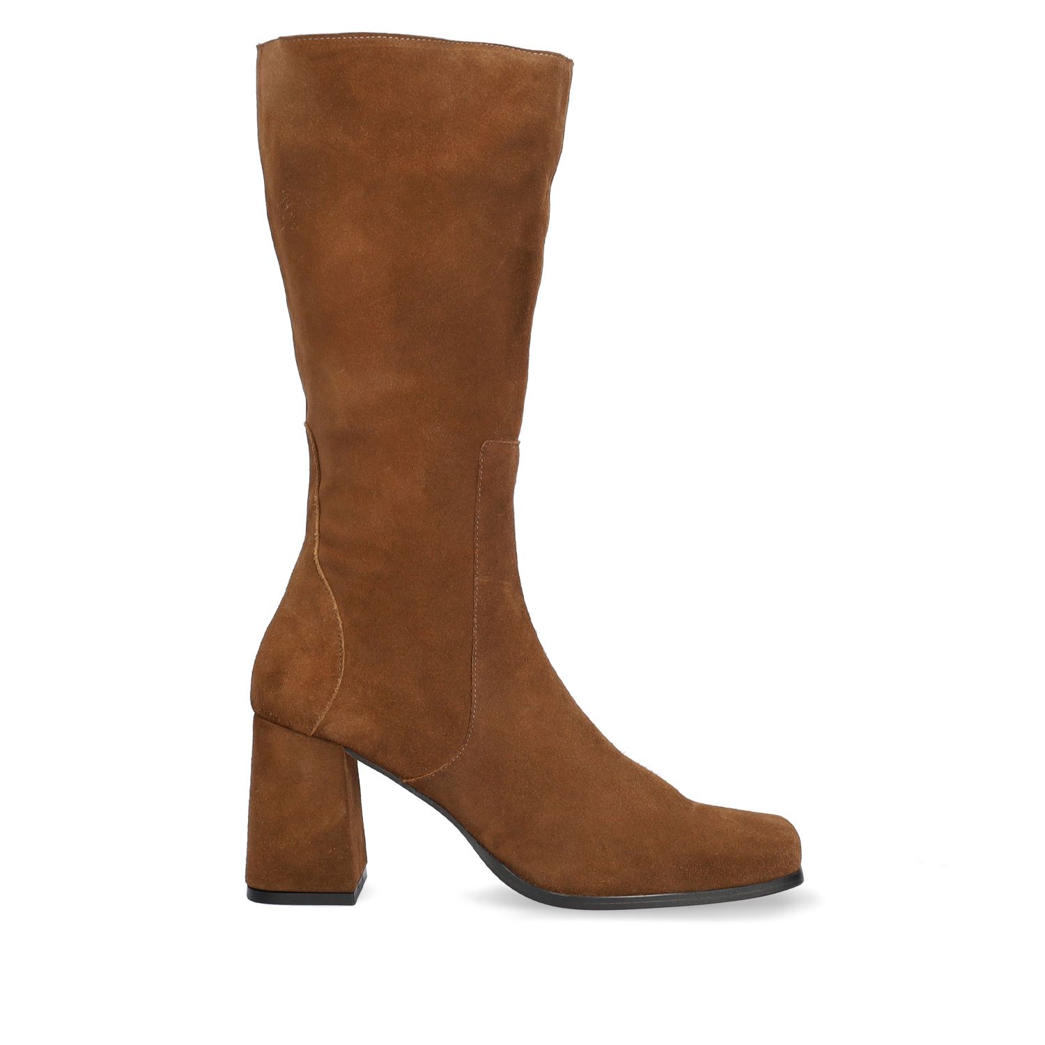 Vysoké čižmy na širokom a vysokom podpätku. Ozdobné prešívanie na päte a v prednej časti sáry. Funkčný zips na vnútornej strane čižmy po celej dĺžke. Všitý elastický klin z vnútornej strany na hornom okraji sáry. Zakončenie so štvorcovou špičkou. Vnútorná podšívka z béžovej kože. Materiál koža semiš. Výška podpätku 7,5 cm pre podrozmerné veľkosti 32-35, výška podpätku 8 cm pre klasické veľkosti 36-41 a výška podpätku 8,5 cm pre nadrozmerné veľkosti 42-45. Vyrobené v Španielsku.