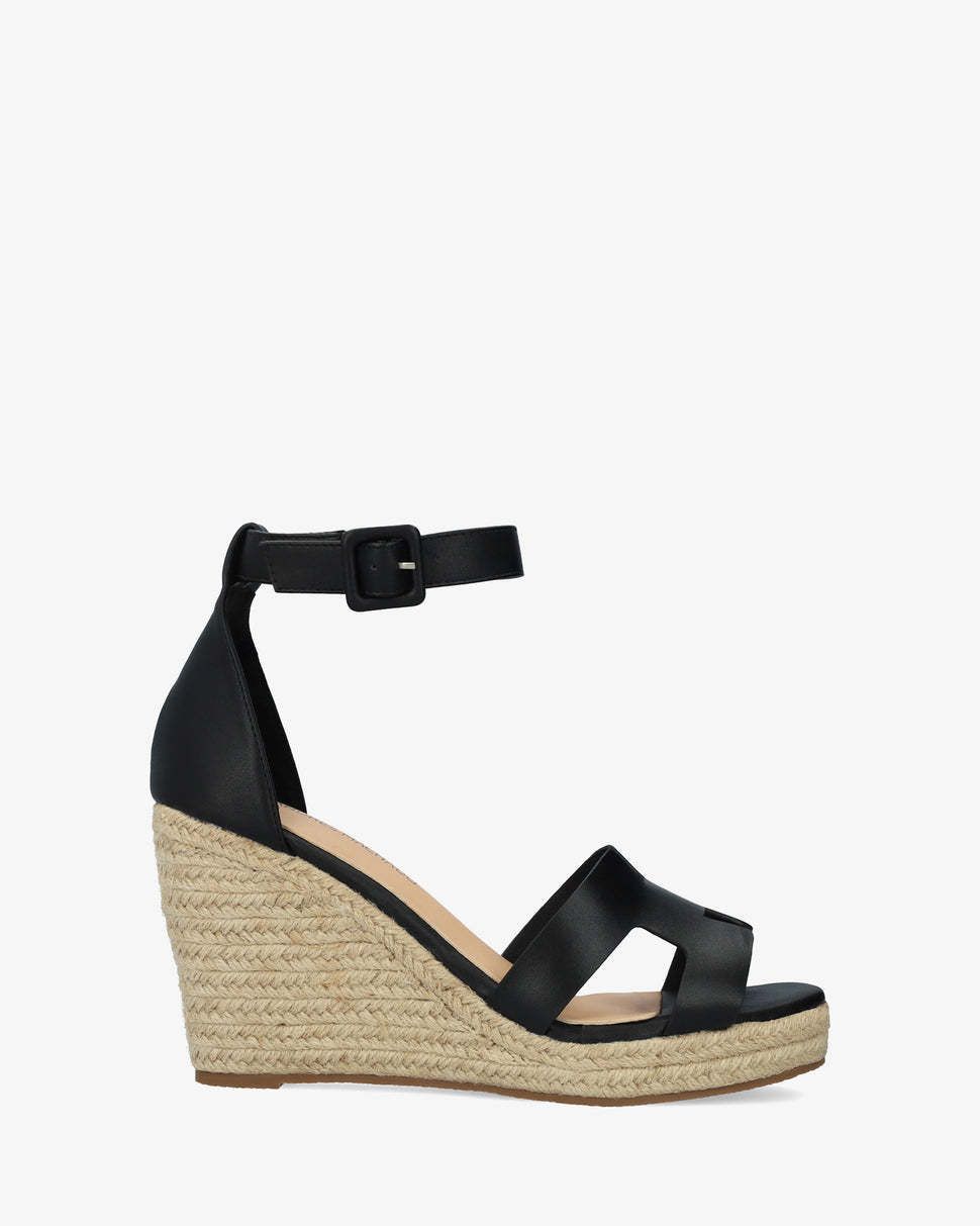 Sandále s uzavretou pätou na jutovej platforme a podpätku. Otvorená, zaoblená špička s dvoma prepletenými remienkam. Remienok okolo členka nastaviteľný pomocou pracky. Materiál koženka hladká a juta.