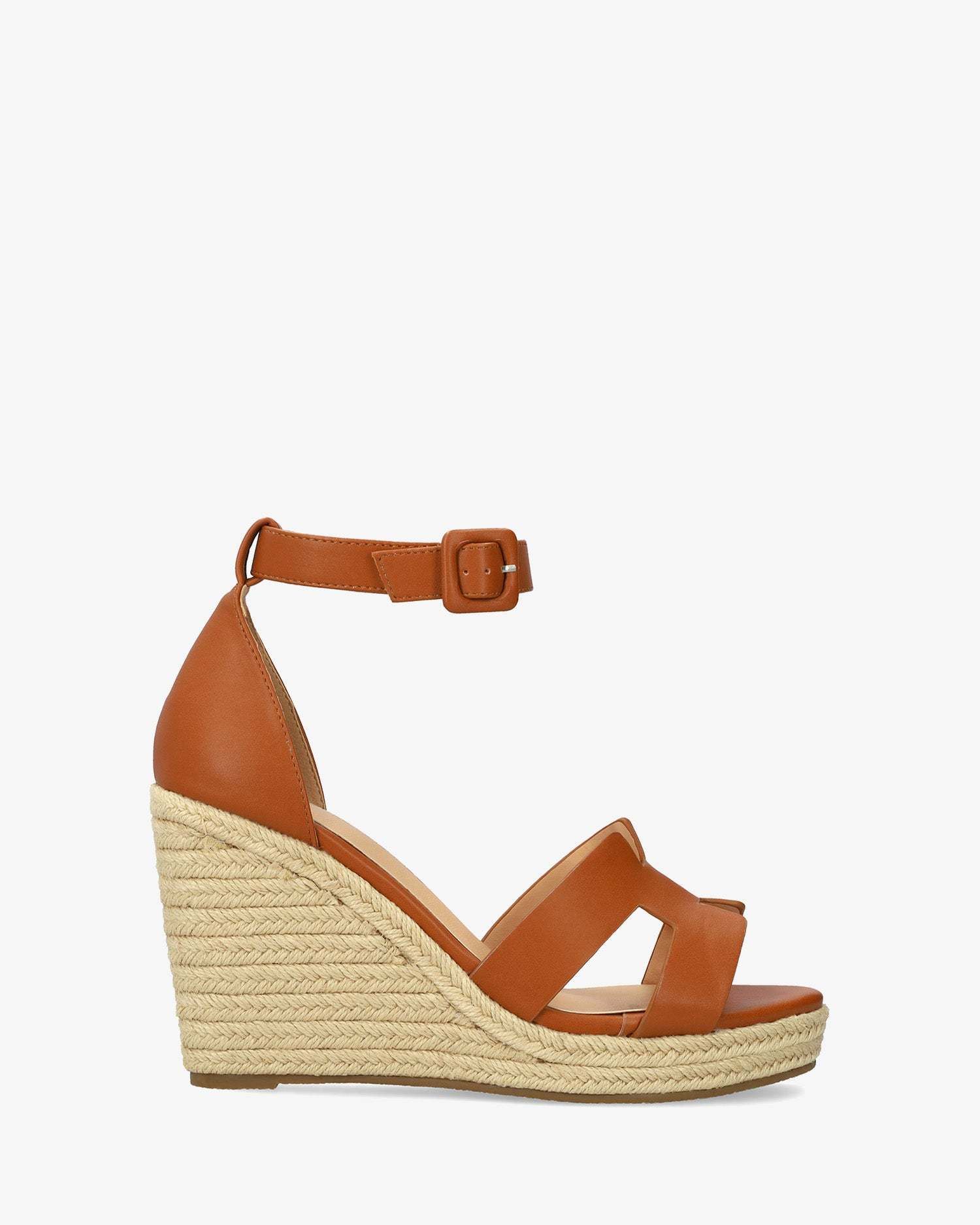 Sandále s uzavretou pätou na jutovej platforme a podpätku. Otvorená, zaoblená špička s dvoma prepletenými remienkam. Remienok okolo členka nastaviteľný pomocou pracky. Materiál koženka hladká a juta.