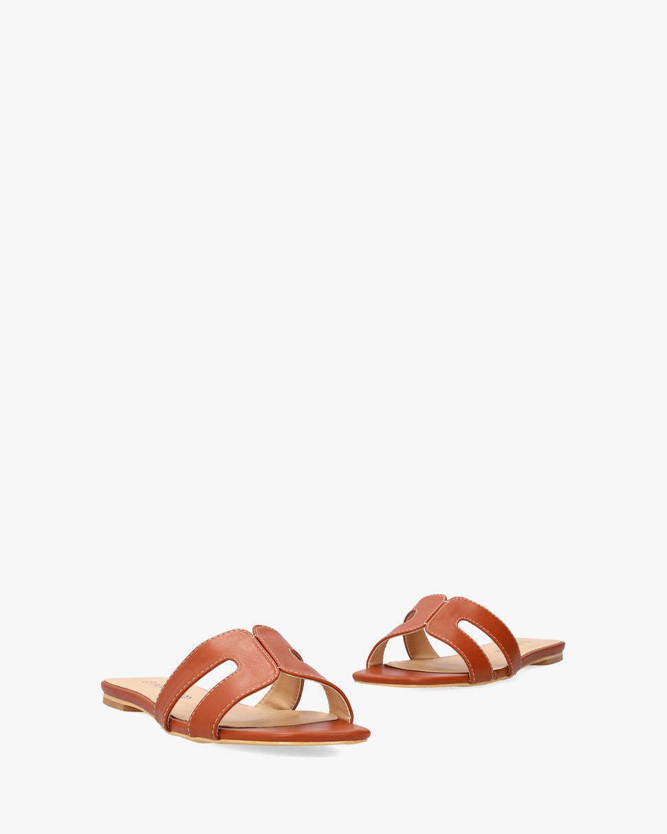 Jednoduché šľapky na rovnej podrážke a minipodpätku. Remienky zošité cez priehlavok, ukončené štvorcovou špičkou. Materiál koženka hladká. Dostupné vo veľkostiach 32-35 a 42-46.