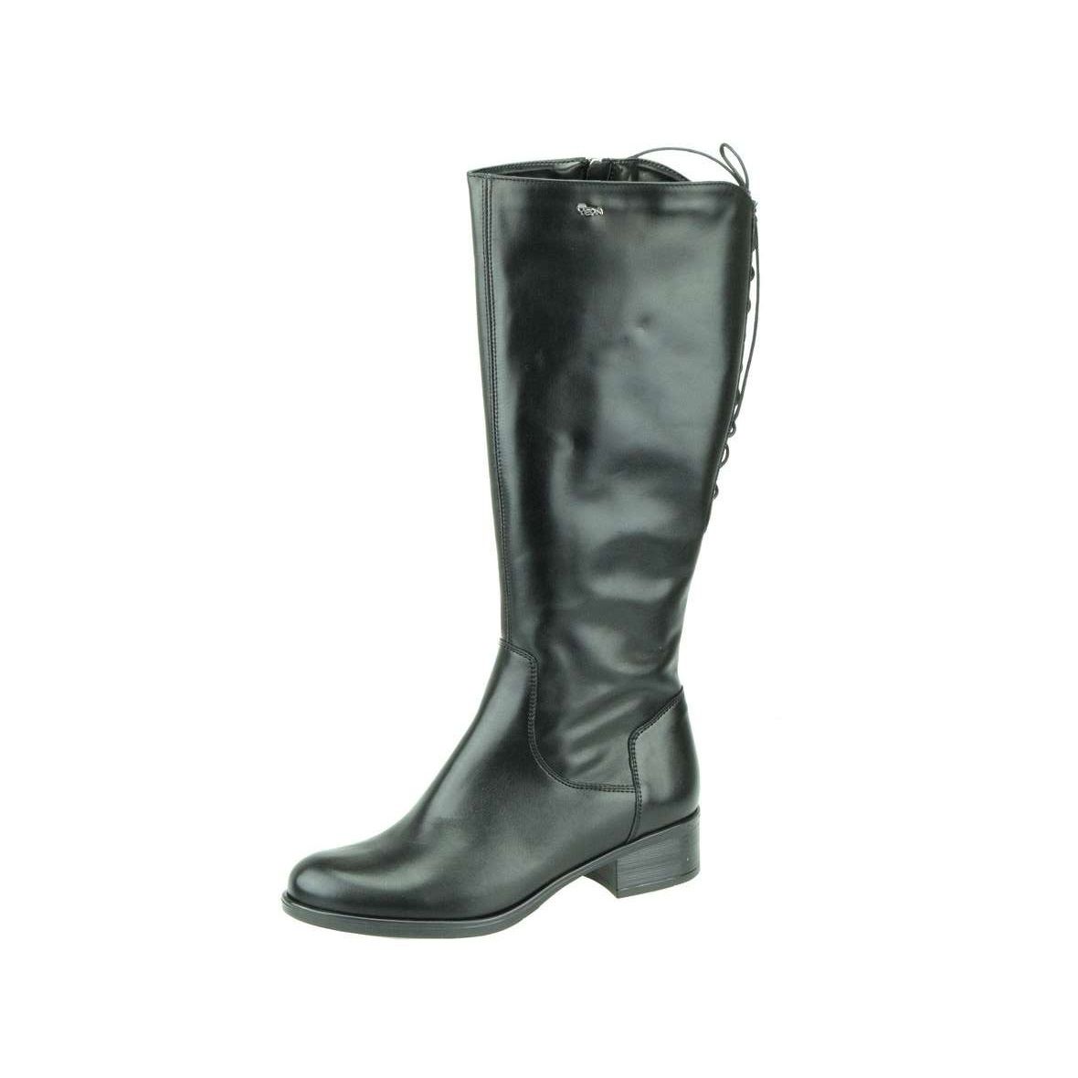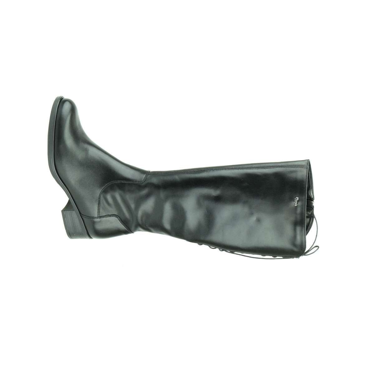 Vysoké čižmy na širokom a nízkom podpätku. Model zaujme praktickým šnurovaním v zadnej časti sáry, vďaka ktorému si môžete upraviť šírku čižmy podľa svojej potreby. Funkčný zips na vnútornej strane čižmy po celej dĺžke. Podšívka potiahnutá hrejivým filcom. Stielka s prvkami pre podporu priečnej klenby. Malé logo v striebornej farbe na vrchnom okraji sáry. Materiál koža, filc. Výška podpätku 3,5 cm.
