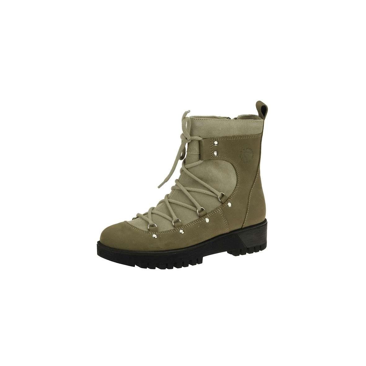Dámske členkové čižmy na robustnej podrážke. Zapínanie pomocou zipsu na vnútornej strane čižmy po celej dĺžke a šnúrok vo farbe. Podšívka ma prvky pre podporu priečnej klenby a je zateplená hrejivým kožúškom. Materiál koža, filc.