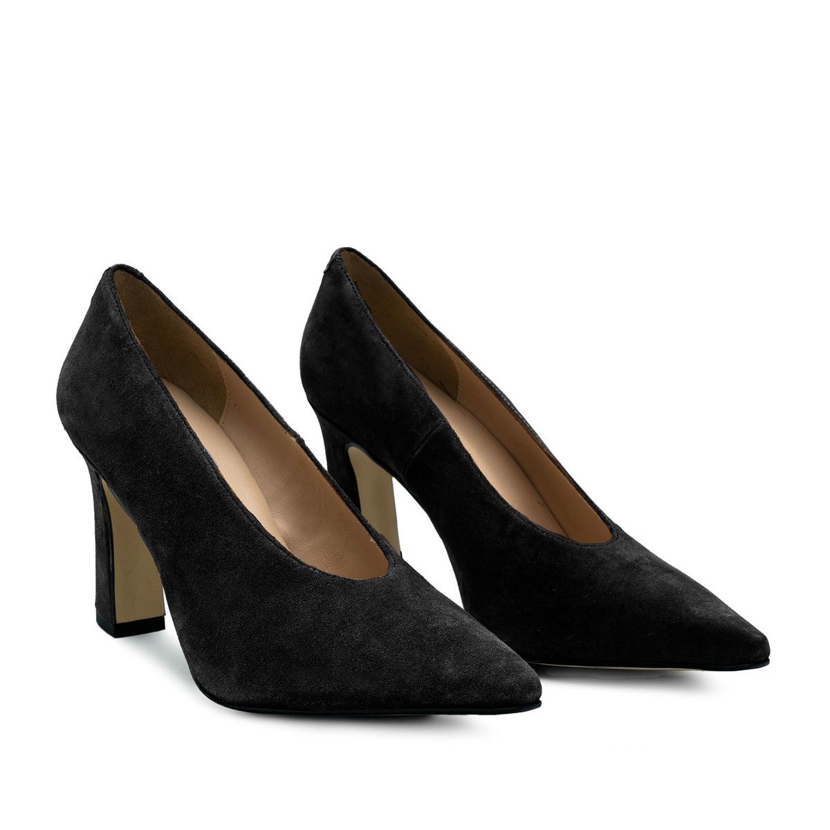 Celosemišové lodičky na vysokom a širokom podpätku s úzkou špičkou. Materiál koža-semiš. Podšívka v béžovej koži. Výška podpätku 8,5 cm pre podrozmerné veľkosti 32-35 a výška podpätku 9,5 cm pre nadrozmerné veľkosti 42-45. Španielska ručná výroba.