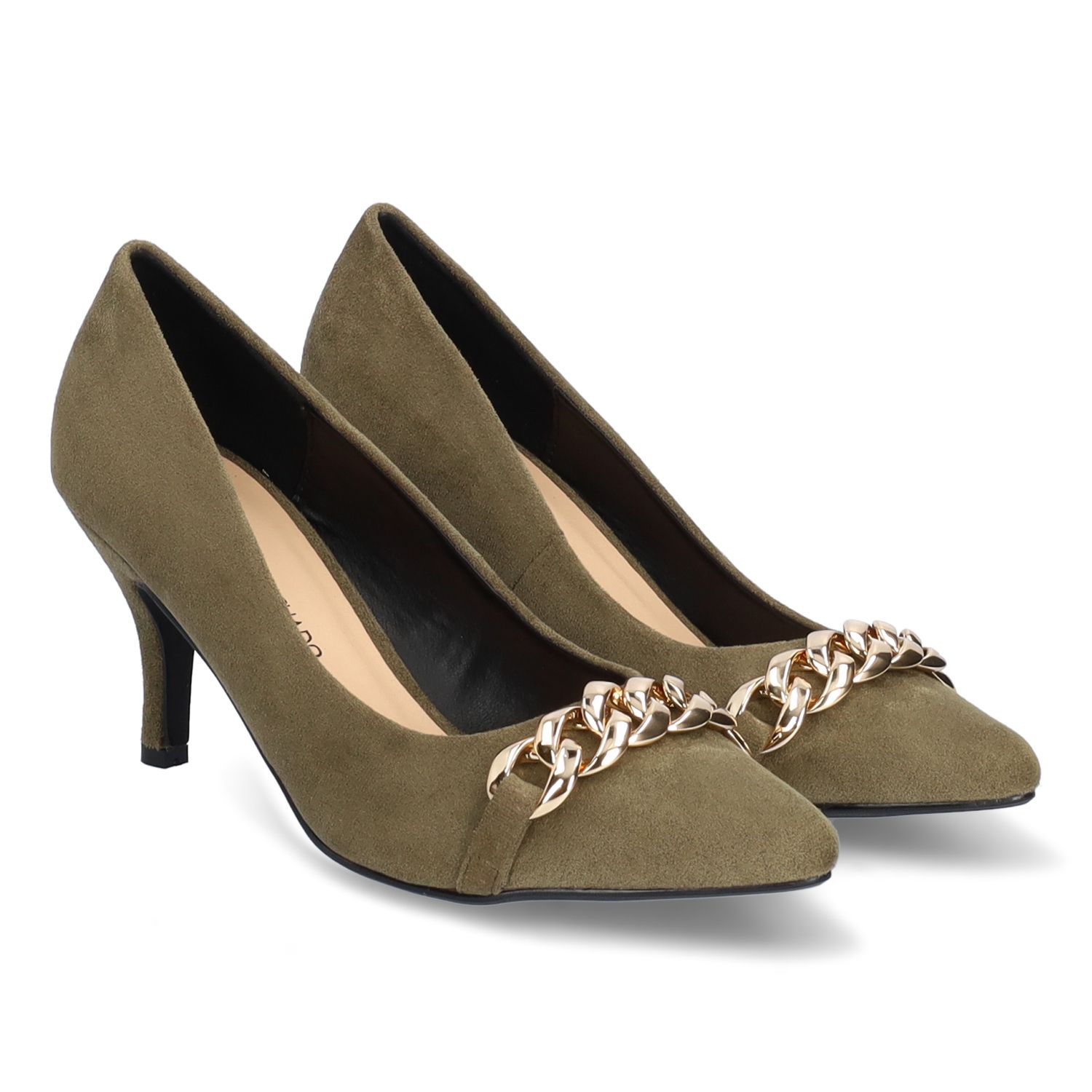 Lodičky na tenkom a nižšom podpätku. Detail maxi zlatých článkov na špičke. Jemne špicaté zakončenie. Materiál koženka semiš. Výška podpätku 6 cm pre podrozmerné veľkosti 32-35 a výška podpätku 8 cm pre nadrozmerné veľkosti 42-45.