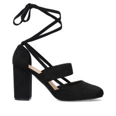 Polootvorené lodičky na širokom a vysokom podpätku. Dizajn so zladenými remienkami od priehlavku po pätu so zapínaním na zaväzovanie okolo členku. Remienok cez priehlavok ukončený gumičkou pre lepšie uchytenie na nohe. Zakončenie okrúhlou špičkou. Materiál koženka semiš. Výška podpätku 9,3 cm pre podrozmerné veľkosti 32-35 a výška podpätku 10 cm pre nadrozmerné veľkosti 42-45.