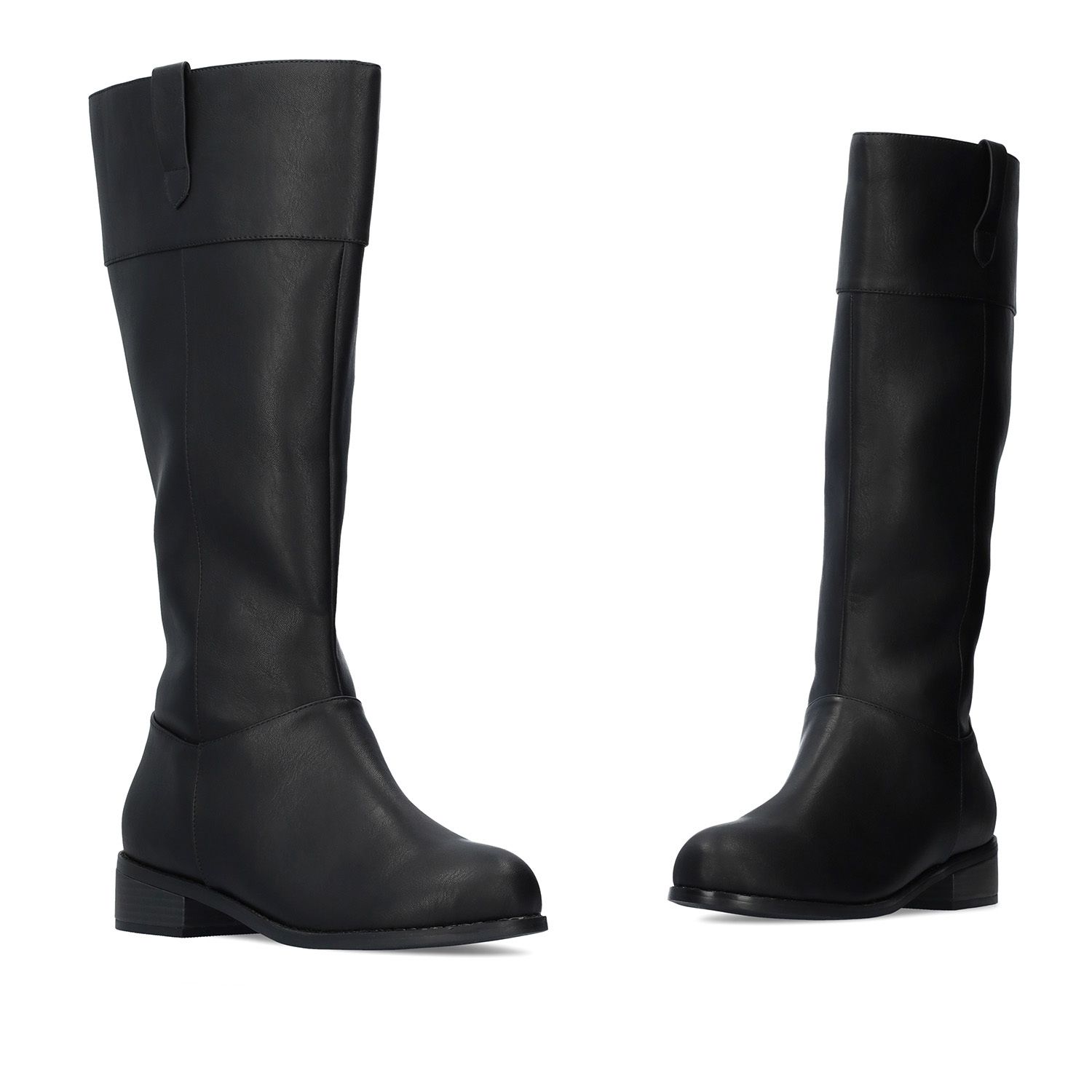 Vysoké čižmy na širokom a nizkom podpätku. Ozdobný lem na hornej časti sáry. Funkčný zips na vnútornej strane čižmy po celej dĺžke. Zakončenie s okrúhlou špičkou. Čierna podrážka. Materiál koženka. Výška podpätku 4 cm. Iba nadrozmerné veľkosti 42-45.