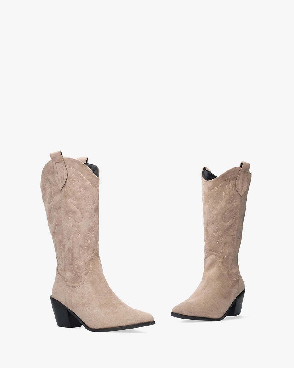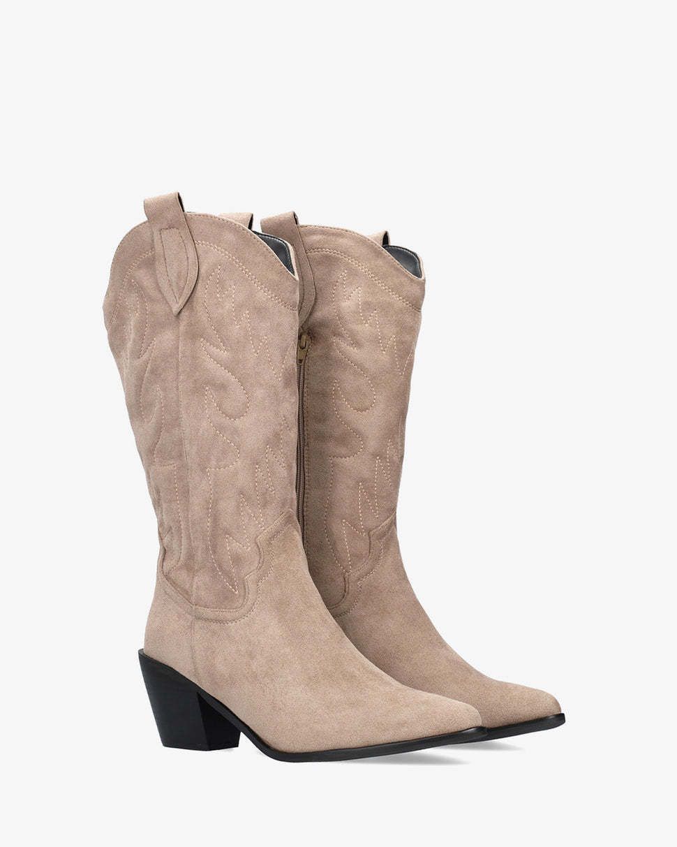 Kovbojské čižmy so špicatou špičkou a ozdobným prešívaním niťou v rovnakej farbe. Funkčný zips na vnútornej strane čižmy. Materiál koženka. Podpätok s efektom dreva s výškou 6 cm pre podrozmerné veľkosti 32-34 a 7,5 cm pre nadrozmerné veľkosti 42-46.