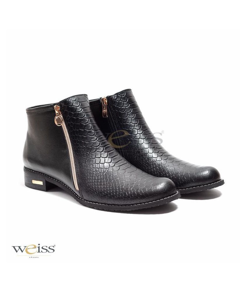 Nižšie členkové čižmy na širokom a nízkom podpätku. Predná časť čižmy vzor hadej kože, zadná hladká. Ozdobný prúžok na podpätku a zips na vonkajšej strane čižmy, funčný zips na vnútornej strane. Materiál koža. Výška podpätku 3,5 cm.