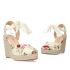 Espadrilky na vysokom klinovom podpätku a platforme. Dizajn s prepletaným niťovým vzorom našitým na remienku cez pätu. Zapínanie pomocou širokej bielej šnúrky okolo členku. Okrúhla uzavretá špička s prekrížením. Materiál koženka látková s kvetinovým vzorom a jutový klin s platformou. Výška podpätku 10,5 cm a výška platformy pod prstami 2,5 cm pre podrozmerné veľkosti 32-35, výška podpätku 12 cm a výška platformy pod prstami 2,5 cm pre nadrozmerné veľkosti 42-45.